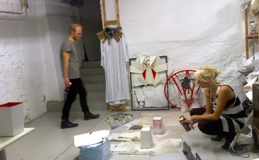 Innan vi flyttade till Stureplan och fina Nya Studion höll vi till i en liten källare i Vasastan – vårt kontor bestod av en liten ateljéplats hos konstkollektivet Detroit. Bilden här är tagen i början av november 2008 när vi förbereder inför releasefesten. Oskar och Linda sprayar popcornbägarna som vi hade som scenografi på festen, och som sedan också dök upp på omslaget till Psykologtidningen!
