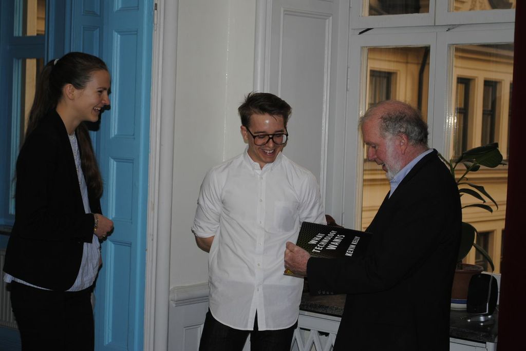 Lycklig Niklas får sin favoritbok, What technology wants, signerad av Kevin Kelly